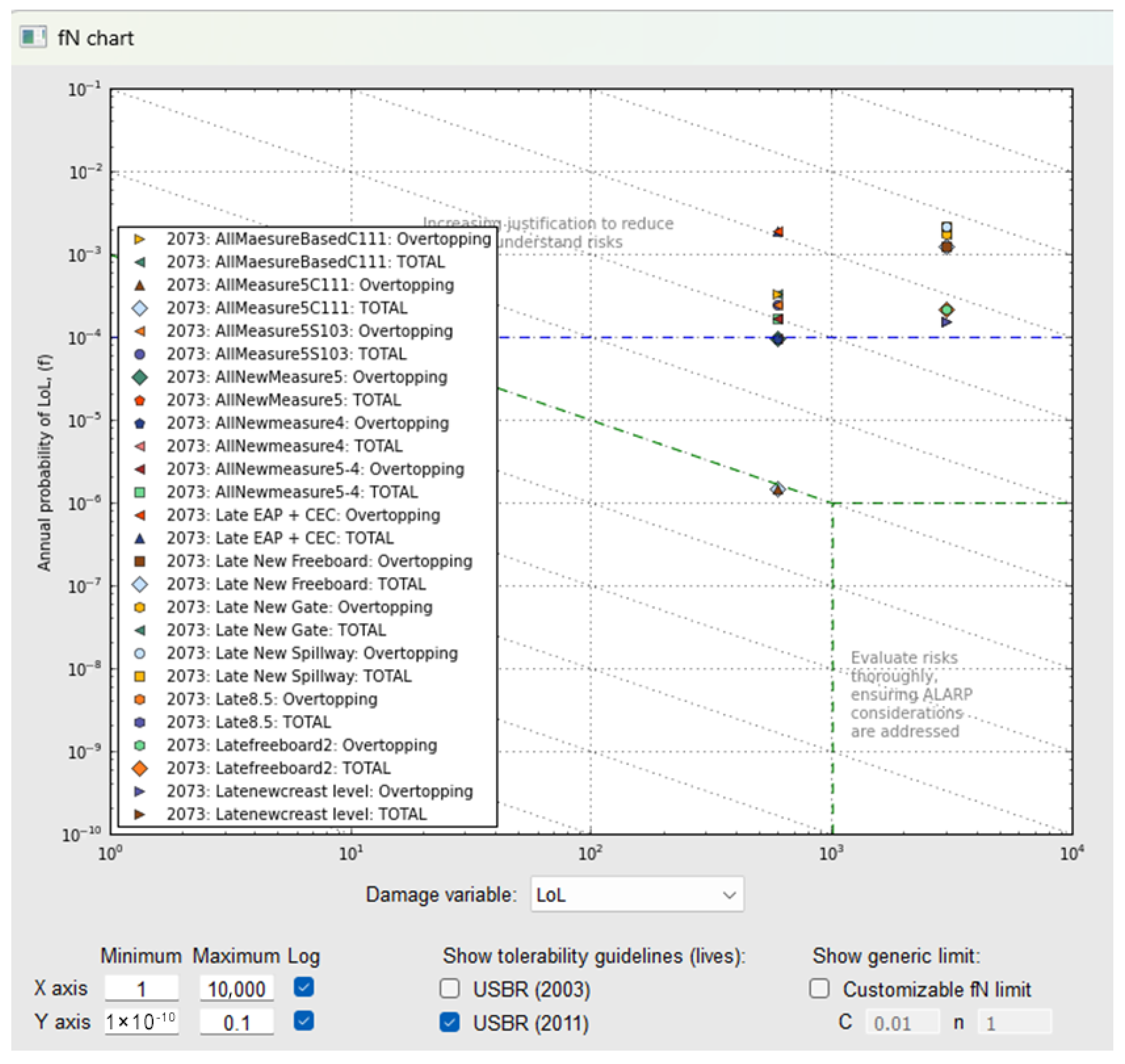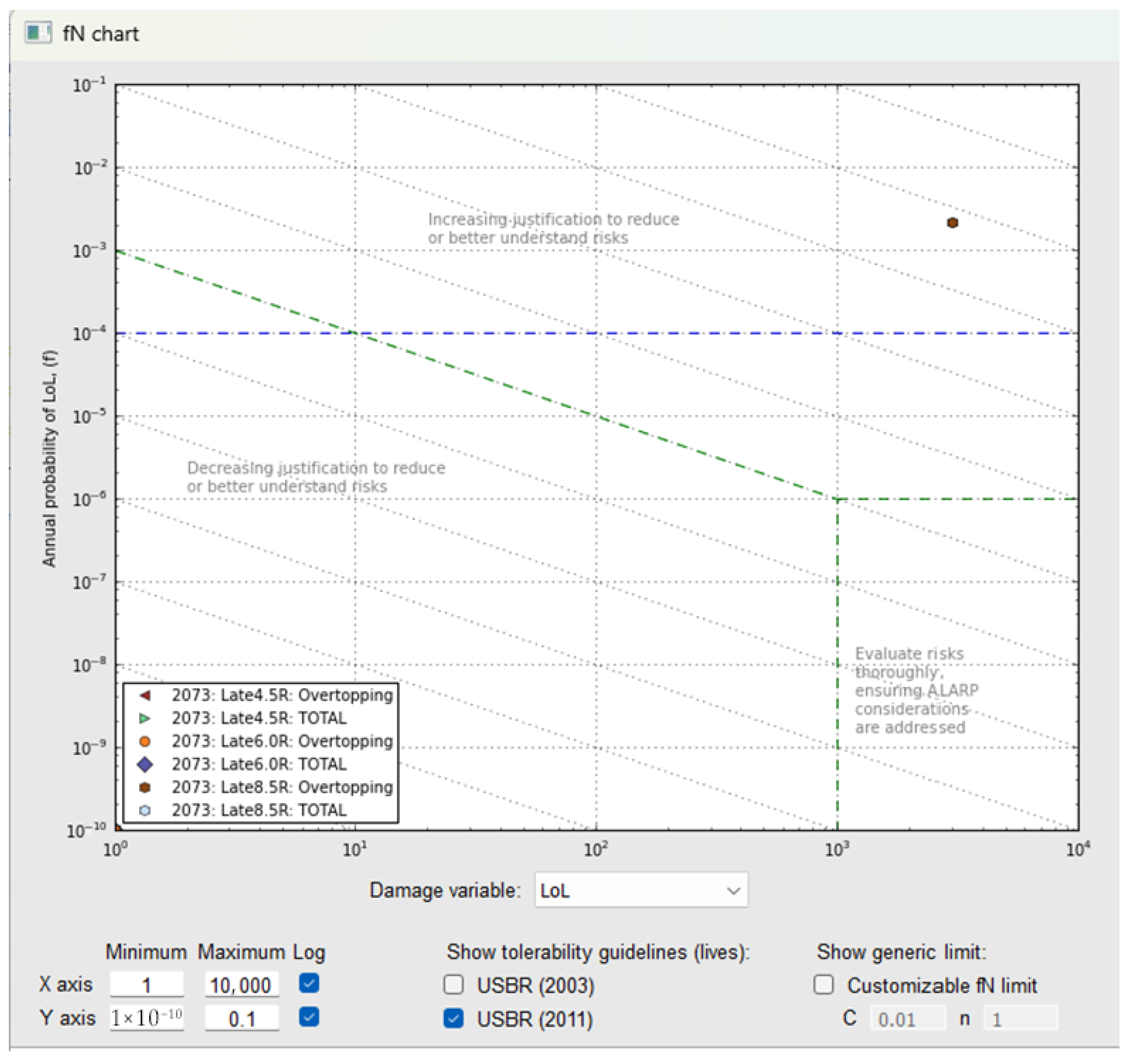 The f–N curve (failure frequency vs. number of fatalities) is a key tool used to evaluate the risk of dam failure, particularly in relation to overtopping events. This curve is derived from the USBR Tolerability Criteria, which establishes the tolerability limit for the annual probability of failure, linking the likelihood of failure to potential loss of life. The curve is used to assess the acceptability of risk in dam safety management, helping to prioritize mitigation measures based on the expected consequences of failure.
