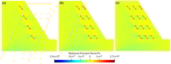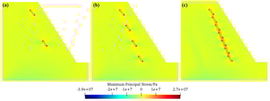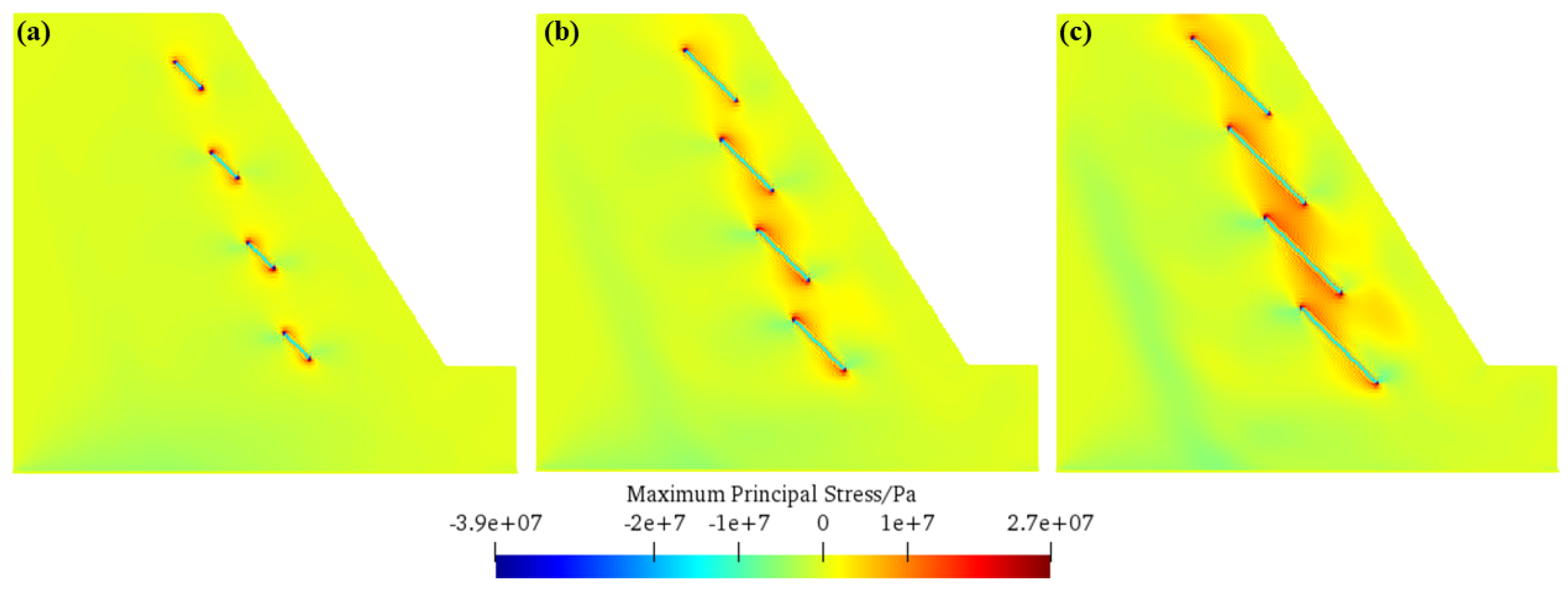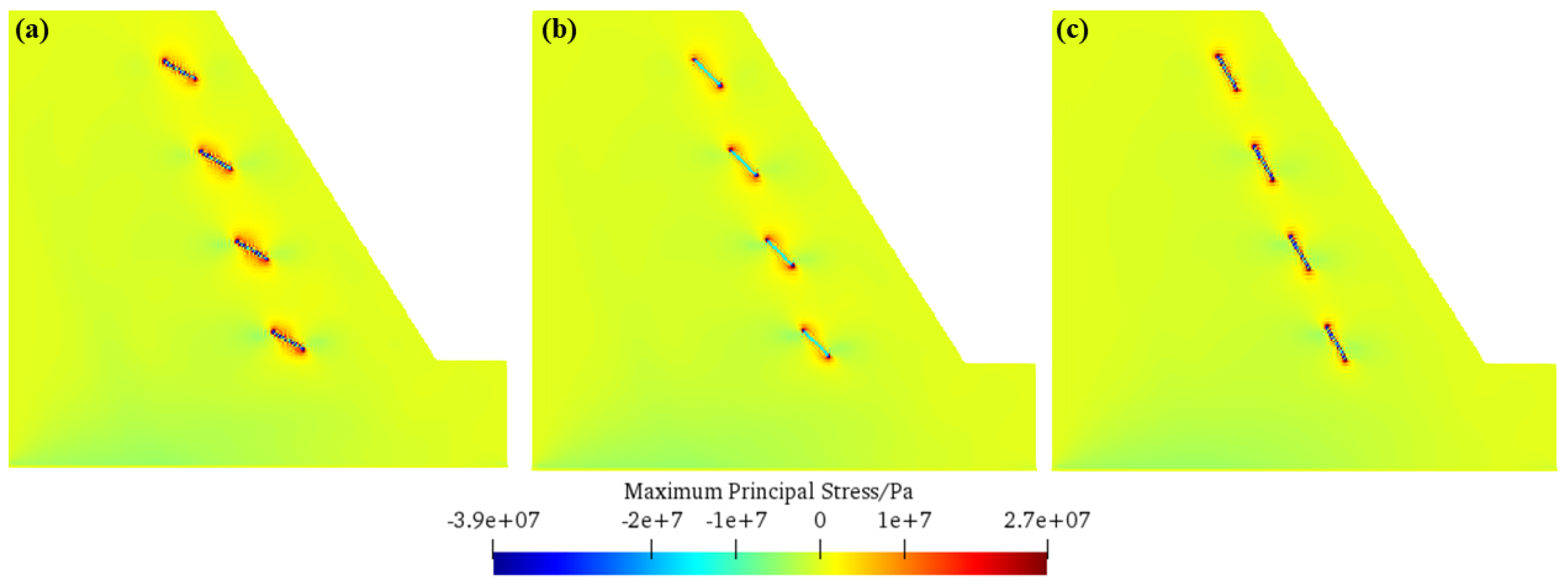 - The relationship between fissure inclination angle and slope frost heave failure morphology has been revealed. For a small inclination angle (e.g., 30°), tensile stress concentration areas near fissure tips are dispersed, and secondary cracks deviate from initial fissure directions and form multi-branch structures, resulting in a “fishbone-shaped” failure mode with nine secondary cracks. As the inclination angle increases to 45° and 60°, tensile stress concentration areas converge to fissure tips; each fissure is approximately in the same straight line; the failure mode transforms into “strip-like”; and the number of secondary cracks decreases to four and three, respectively. This shows that the increase in fissure inclination angle changes the distribution of tensile stress concentration areas, thereby altering the development direction of secondary cracks and the final failure morphology.