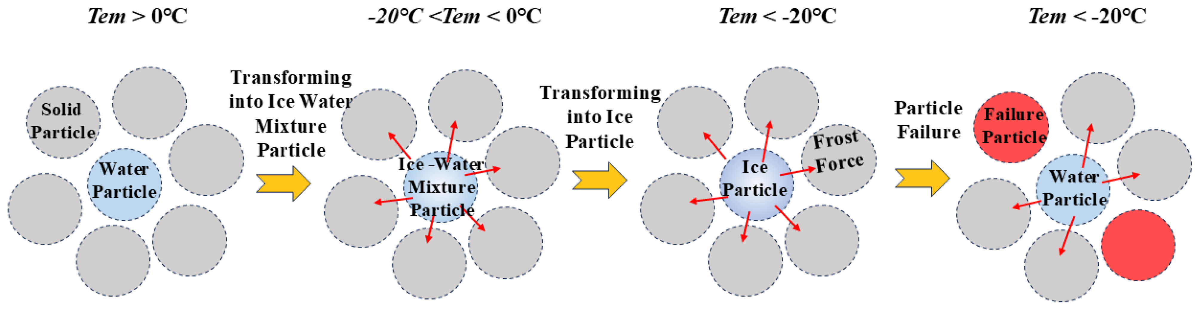 - Ice particles: When T < 20 °C, the water in fissures is completely frozen, defined as “ice particles”. At this time, the frost heaving force reaches its maximum value, and the particle type is marked as Type = I.
