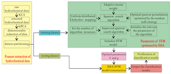 In this study, taking the Gubei colliery in Huainan mining area as an application case, 70 groups of water samples after CBE calculation are selected from four limestone aquifers (C3I, C3II, C3III, and O1+2). Nine hydrochemical indicators are chosen, and the KPCA is performed on the indicators to eliminate redundant information between the raw data. The Improved Sparrow Search Algorithm (ISSA) is employed to automatically determine the optimal values of the SVM model’s two pivotal parameters: the penalty factor C and the kernel parameter g. Finally, we establish the KPCA-ISSA-SVM hybrid model and conduct the prediction effect verification analysis with the other comparative models. The specific conclusions are as follows:
