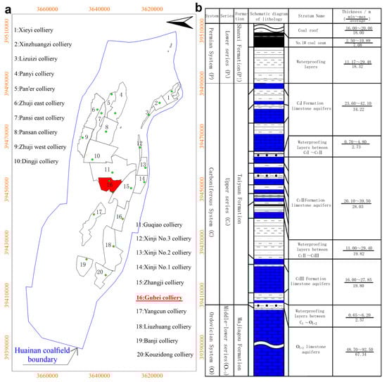 Location of the study area and spatial structure of limestone aquifers. (a) Distribution of collieries in the Huainan coalfield. (b) Limestone aquifer structures.