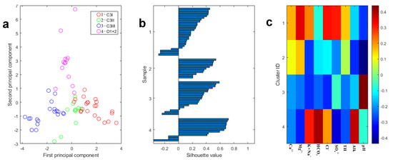 K–means clustering analysis is performed on the MATLAB R2023a platform. The visualized analysis results are shown in Figure 3. As shown in Figure 3a, the distribution of sample points of different categories is separated, indicating that the K–means clustering effect is good, except for five sample points of the C3I cluster that fall into the range of the C3II cluster. This inconsistency with test results may be related to the hydrogeological processes and local geologic structure. We reclassify the type of these five sample points into the C3II cluster, considering the existence of test bias and water conductivity between aquifers. Figure 3b demonstrates the silhouette distribution of four types of water samples. The silhouette values of most samples are relatively high, indicating that the clustering structure is stable. In addition, we present the contribution degrees of nine hydro-chemical indicators to four types of clustering, as shown in Figure 3c. Suppose the intensity of a particular index is significantly high or low in a specific cluster. In that case, this indicator substantially distinguishes this cluster from other clusters. For cluster 1, the discriminative indices are Mg2+, Cl−, SO42−, and pH. K+ + Na+, Alk., and pH can be significant indices to characterize cluster 2. K+ + Na+, Cl−, and pH contribute more to cluster 3. While K+ + Na+, HCO3−, SO42−, and Alk., contribute a lot to discriminating cluster 4.