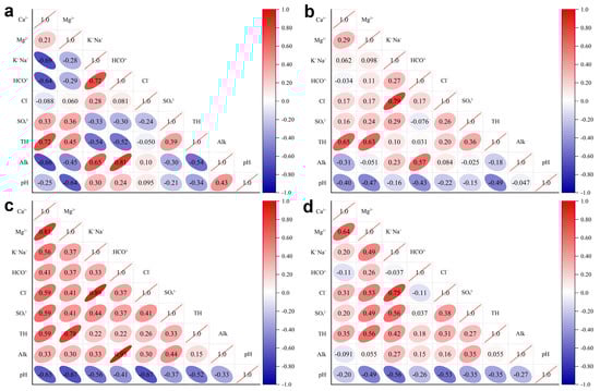 Correlation analysis of hydro-chemical indicators. (a) C3I water samples. (b) C3II water samples. (c) C3III water samples. (d) O1+2 water samples.