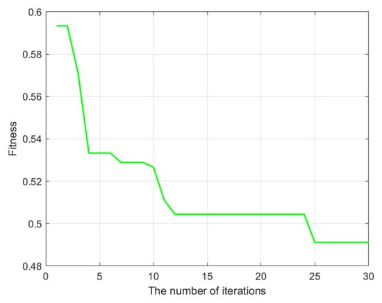 In the KPCA-ISSA-SVM model, the penalty factor C and kernel parameter g range from 0 to 5.0, and a population quantity is set to 8 in ISSA. A maximum number of iterations is set to 30. Figure 6 shows the iterative fitness curve throughout the training process, which is based on the data training, and plots the fitness values for each iteration. As the number of iterations increases, the optimal fitness steadily declines. When the KPCA-ISSA-SVM model undergoes twenty-five iterations, its fitness reaches its lowest point, indicating high convergence accuracy. The model’s misclassification rate has decreased when the fitness value does not noticeably change at later iterations. We utilize the improved sparrow search algorithm (ISSA) to optimize and obtain the optimal parameters, including the penalty factor C and kernel parameter g, and the results are C = 3.2587 and g = 3.8268. Finally, we have established the KPCA-ISSA-SVM hybrid model to identify mine water sources.