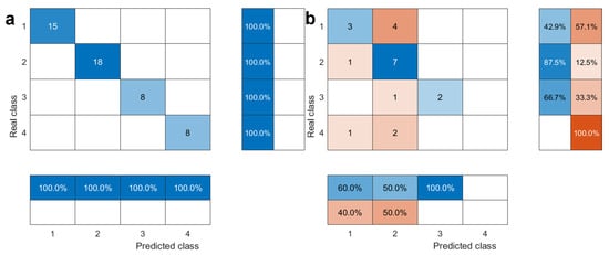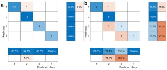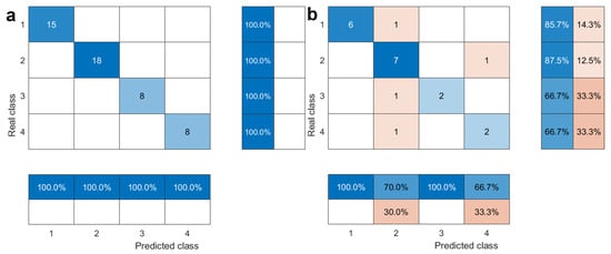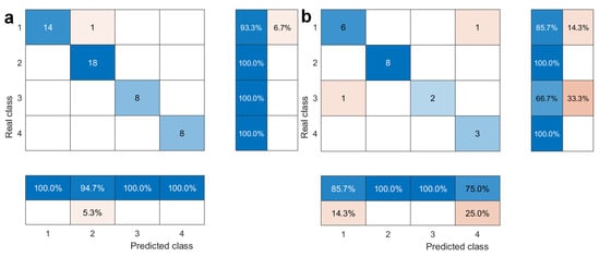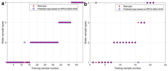 Figure 7 shows the prediction results of the KPCA-ISSA-SVM hybrid model for the training and testing datasets, and Figure 8 shows the confusion matrix. Figure 7a and Figure 8a show that the model exhibits a misclassification rate of 2.04% for the training samples, i.e., a discrimination accuracy of 97.96%. This indicates that the model is better suited to the training samples.