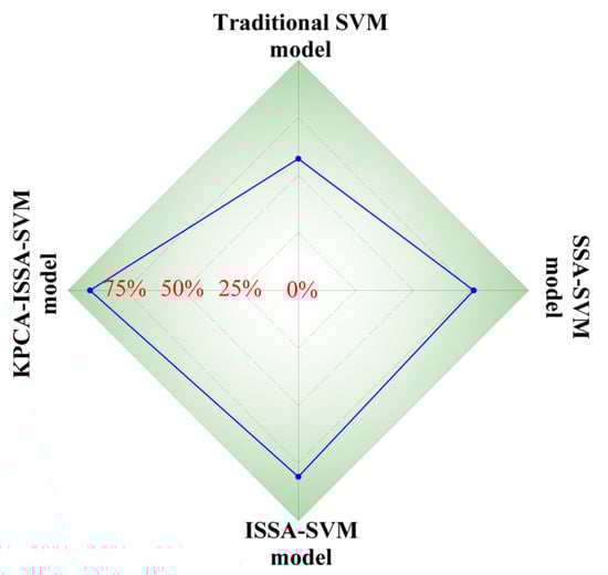 - A comparative study is conducted to evaluate the KPCA-ISSA-SVM model against three benchmark models (SVM, SSA-SVM, and ISSA-SVM) through seven evaluation metrics of accuracy, P, R, F1-score, K, MCC, and G-mean. The results show that the KPCA-ISSA-SVM model demonstrated significantly higher values in seven evaluation indexes, suggesting that it outperforms the other benchmark models.