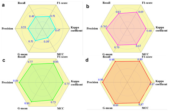 To comprehensively assess the performance of the four models, their discrimination outcomes were examined using the confusion matrices derived from the testing samples. Each model was evaluated across multiple metrics—including precision (P), recall (R), F1-score, Kappa coefficient (K), Matthews Correlation Coefficient (MCC), and geometric mean (G-mean)—All computed based on the confusion matrix [44,45,46,47]. The definitions and implications of these metrics are outlined below: Precision refers to the proportion of correctly predicted positive instances among all predicted positives. Recall indicates the percentage of actual positive cases that were accurately predicted. The F1-score, ranging from 0 to 1, represents the harmonic mean of precision and recall, and is particularly useful for evaluating classification performance on imbalanced datasets. The Kappa statistic serves as a measure of classification consistency beyond chance agreement. MCC incorporates all elements of the confusion matrix and offers a balanced evaluation that is robust to class imbalance, with values between −1.0 and 1.0, where higher values indicate better predictive performance. In multi-class settings, MCC is generalized using a confusion matrix over K classes. In addition, the G-mean metric is usually employed to assess classifier performance on imbalanced data distributions. The quantitative formula for calculating evaluation metrics is presented by Equation (9).