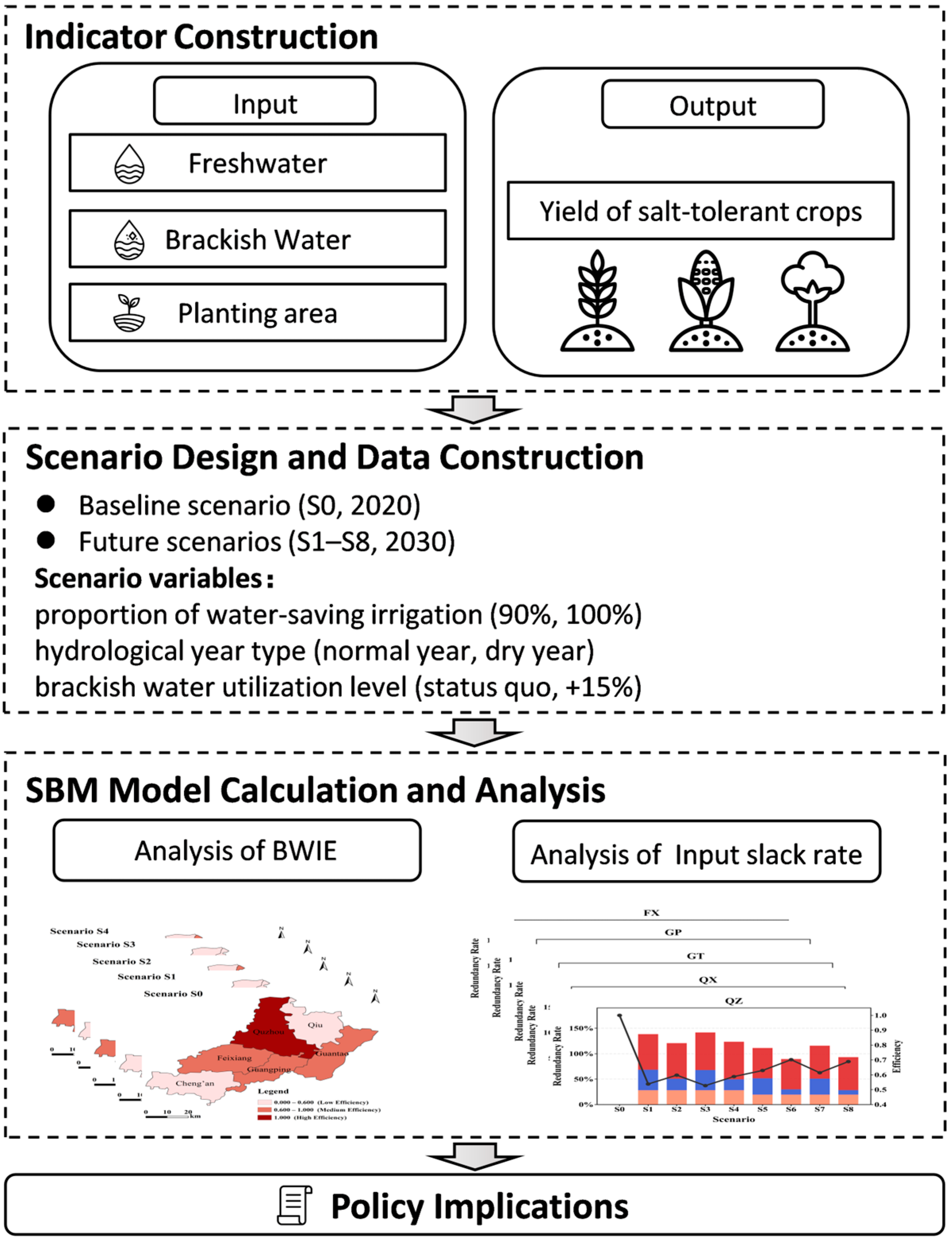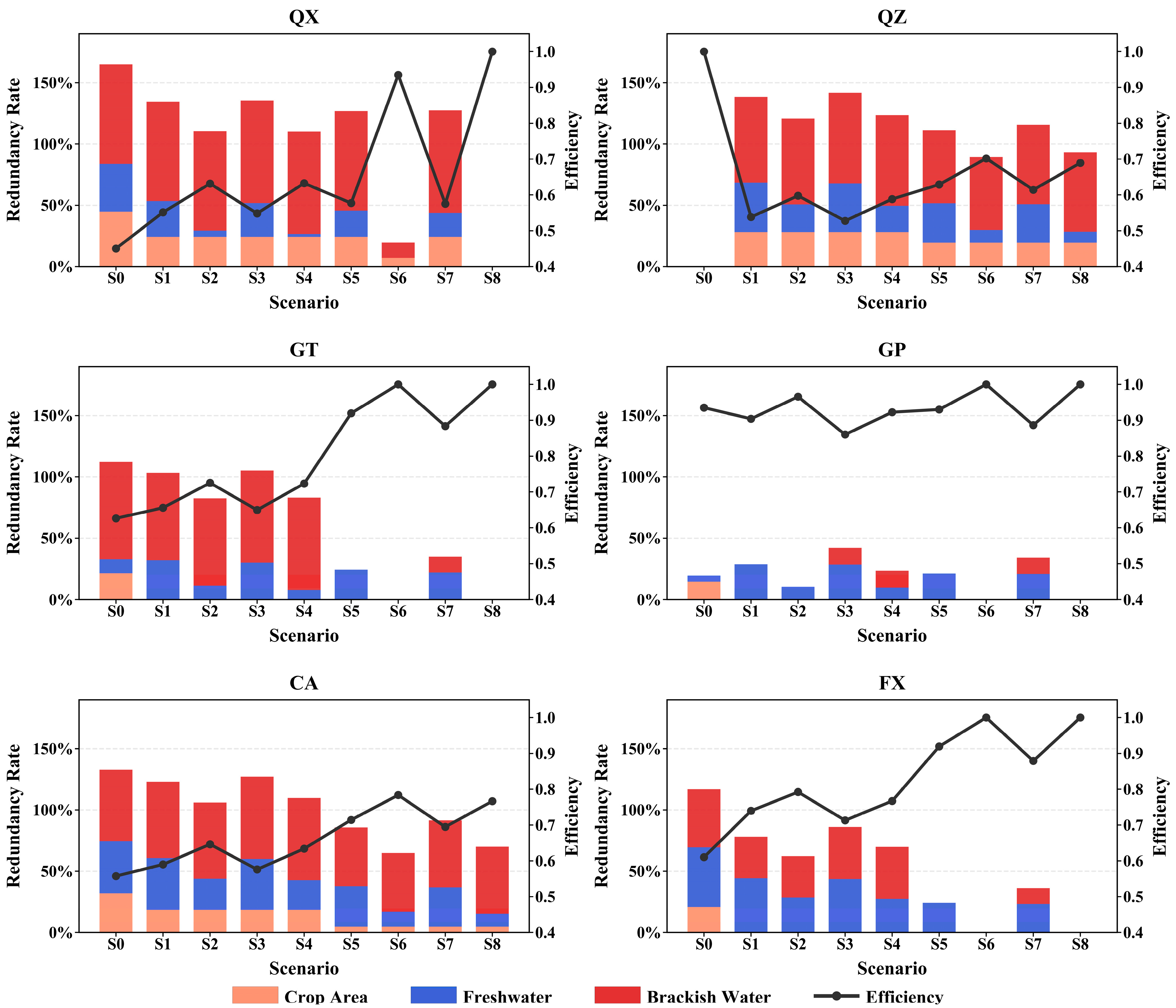 - Brackish water utilization level: Set at the same level as the baseline year, with an additional 15% increase for one of the scenarios, which simulates the potential substitution capacity under enhanced salt-tolerant crop planting and water quality management.