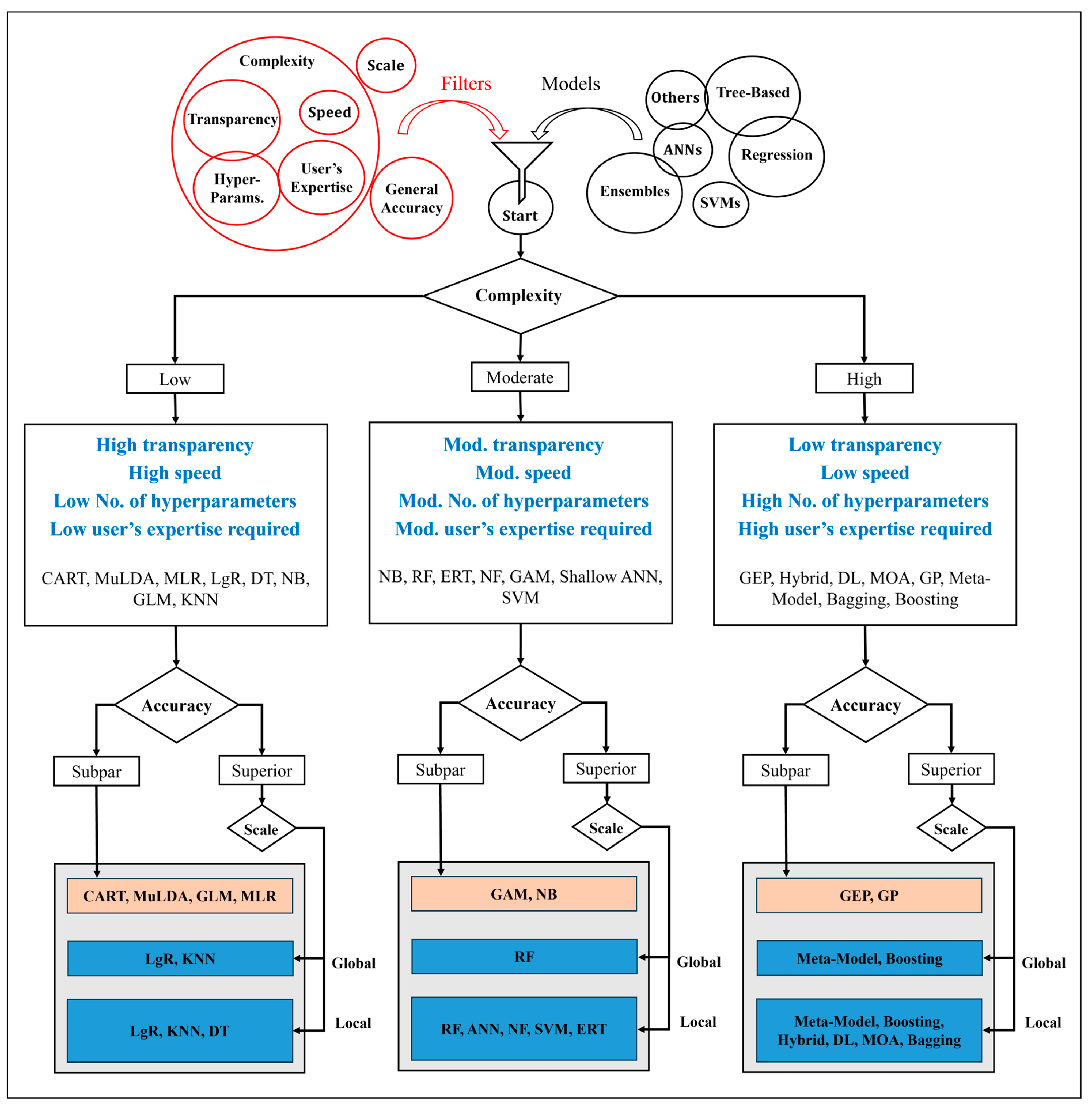 - Computational efficiency: Some studies considered documenting computational details (e.g., computation time [135,155,171,182,183] and the used operating system [171,176,180]). These two factors can reflect important information regarding an informed selection of efficient MLs, due to the complexities of some MLs and occasional limitations in computer facilities. Moreover, utilizing penalty functions to constrain the model’s complexity is another promising direction for proper selection of the model (and predictive variables). However, it was observed in a small portion of the surveyed articles (e.g., Refs. [152,158,163,182]). To exemplify, in Refs. [135,171], the outstanding model not only achieved the highest accuracy, but also was quicker in terms of training time (and convergence of the solution [183]). Further, Ref. [158] indicated that its superior model achieved these merits along with the lowest penalty expressed by AIC and BIC.