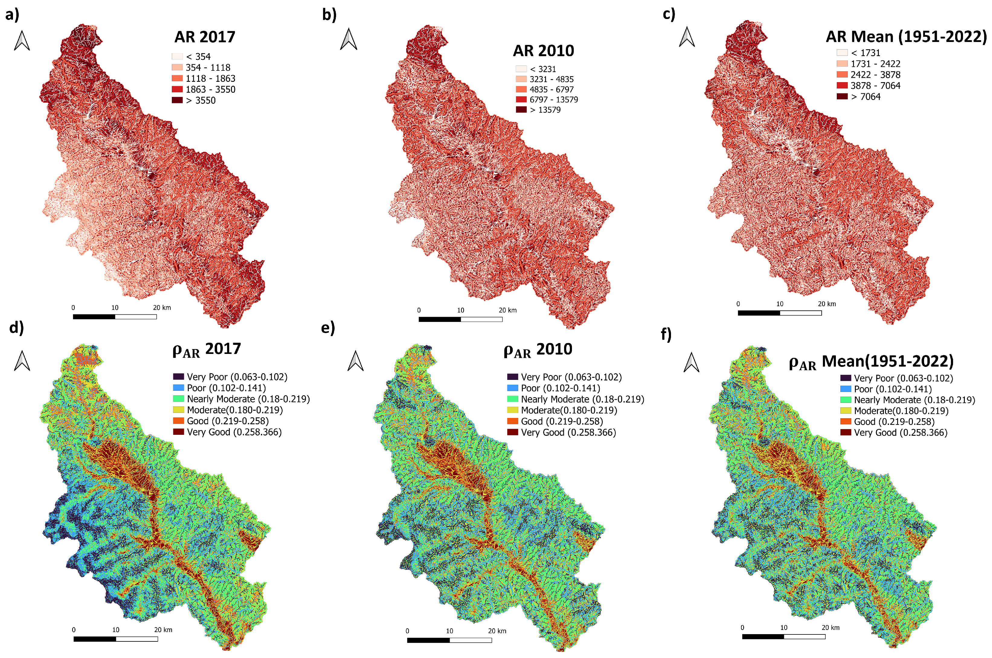 The series of figures clearly emphasizes the effect of the runoff coefficient. As expected, (panels d–f) generally assumes values proportional to the rainfall. Focusing on the spatial distribution the water poor year, panel (a), shows a high spatial heterogeneity of the runoff coefficient, determined by the spatial variability of the soil characteristics and the saturation dynamics, while the water-rich year, panel (b), shows a low spatial variability of the , probably due to a more homogeneous temporal distribution of rainfall and soil saturation. The high spatial variability of the obtained for 2017 is also reflected in a more pronounced variability of the . When comparing the scenarios, significant differences in values are immediately evident especially in the western and central parts of the basin. These differences should not be underestimated when selecting the optimal locations for potential index. The latter is particularly important considering that during drought periods, rainwater harvesting structures can play a strategic role in water resource management.