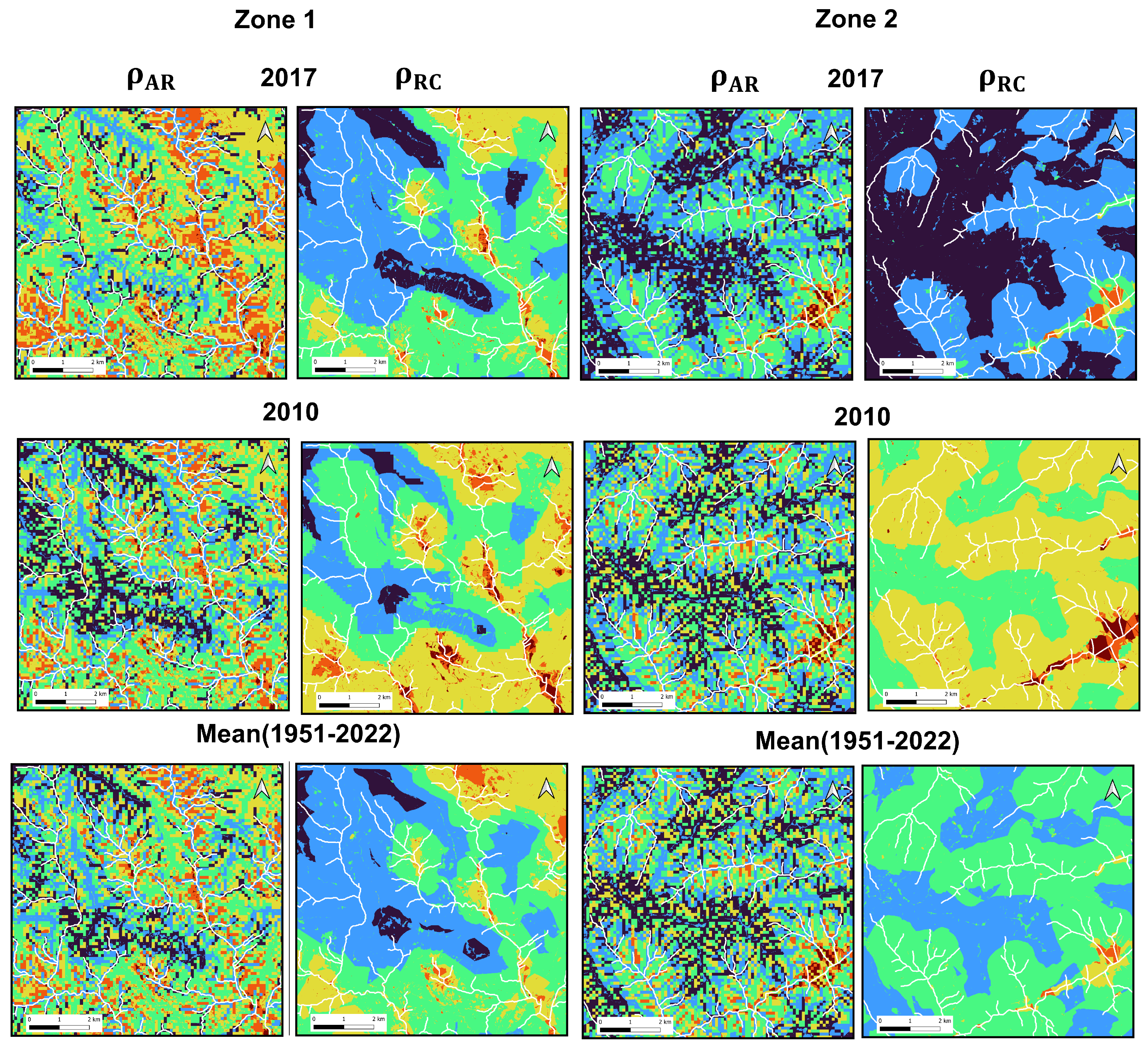 As in the previous case we observe a dependence of the final on the annual rainfall, with higher or lower values in water-rich and water poor years, those differences are quite intuitive and do not need additional discussion. However, in the case of , the effect of the temporal variability of rainfall is less pronounced than in the case. The large differences observed in Zone 2, where the classification changes completely, are not present in the map. This map is characterized by greater stability, which is partially related to the use of quantiles in the classes definition.