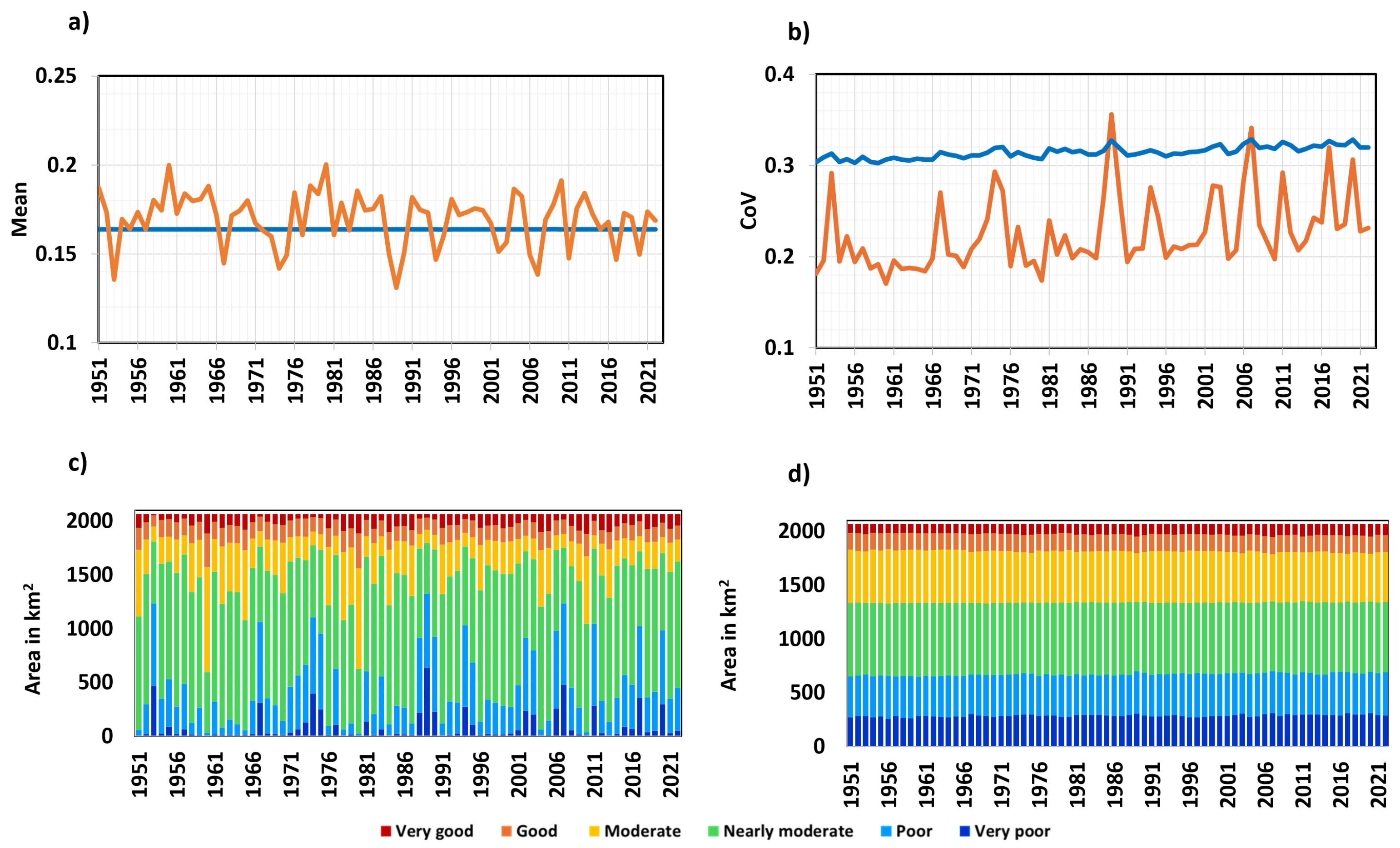 RWH structures at catchment scale. Panels (a) and (b) show general spatial statistics of the indexes for the years from 1951 to 2022. Panels (c) and (d) show the percentage/total area in each class for the 2 indices, different colors pertain to different classes. In the processing of the first two graphs, the index values have not been reclassified, i.e., they are those obtained from Equation (
