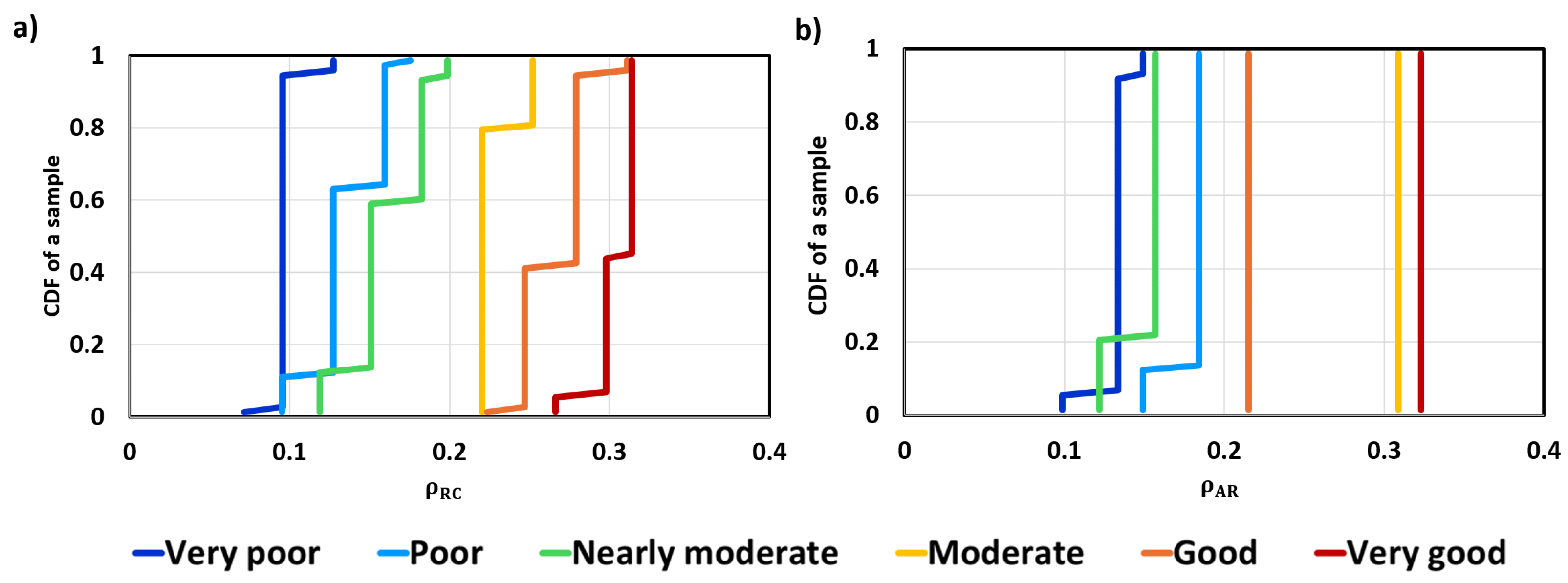Now we move to the analysis of the variability of the area fraction in the different classes depicted in panels (c) and (d); as in the previous analysis, the percentages associated with are characterized by a high temporal variability with the values significantly depending on the total amount of rainfall, values varies up to tens of units in percentage, such as for the “Moderate” class, while the percentage of the “Very good” class varies from a minimum of 1% to a maximum of 10%. On the other hand, the area classification by the shows very stable values, identifying 4% of the catchment area as “Very good”. The stability of the values indicates the reduction in uncertainty in the selection of areas for the implementation of structures; this feature makes the new index particularly suitable as a tool for the planning of basin management policies and the optimal allocation of economic resources.