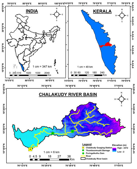 The CRB (Figure 1), located in central Kerala, India (10°10′ N–10°30′ N; 76°15′ E–76°55′ E), covers an area of approximately 1704 km2. Originating from the Anamalai Hills of the Western Ghats, the river flows westward for about 145.5 km before merging with the Periyar River system. Elevation ranges from over 1568 m in the upper catchments to −3 m in the coastal plains. The basin exhibits a dendritic drainage pattern and includes significant tributaries such as the Karappara, Kuriarkutty, Peruvarippallam, Thunacadavu, and Sholayar river. Annual precipitation ranges from 2500 to 5000 mm, primarily received during the southwest monsoon. The region features diverse landforms, including forested highlands, agricultural midlands, and urbanized lowlands. Land use/land cover includes tropical evergreen forests, plantations, paddy fields, settlements, and wetlands. Major hydrological structures include the Poringalkuthu Dam and Thumboormuzhi Barrage, which influence the flow regime and water availability across the basin.