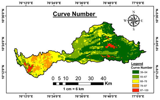 The Curve Number (CN) represents the hydrological characteristics of the soil and land cover [51]. It ranges from 30 (high infiltration, low runoff potential) to 100 (impervious, high runoff potential) [52]. CN values were assigned based on standard tables from the USDA SCS handbook and reflect the study area’s land cover and soil type.