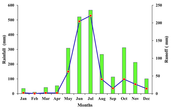 Variation in the 21-year (2001–2023) monthly averages of rainfall (Bar) and runoff (line) for the CRB.