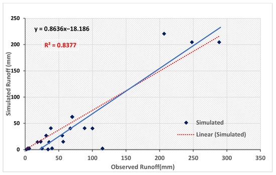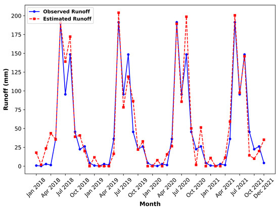 The comparison of observed and estimated runoff from 2018 to 2021 (Figure 5) shows that both series capture the seasonal variation, with high flows during the monsoon and low flows in the dry months. While the timing of peak flows is well represented, the estimated runoff consistently overestimates the observed values, particularly during monsoon peaks. The model performed well in predicting the runoff values, with an RMSE of 29.37 (mm), indicating the average deviation between predictions and actual data. The NSE and R2 values were both 0.83, (Figure 6 and Table 3) showing a strong correlation and good agreement between simulated and observed values. The ME of 13.48 suggests a slight overestimation. The KGE value of 0.81 indicates a balanced model in terms of correlation, bias, and variability. These results are consistent with findings from similar studies in monsoon-driven basins, where NSE values typically range between 0.7 and 0.8, R2 ranges from 0.7 to 0.85 and KGE values between 0.7 and 0.8 are considered satisfactory for hydrological applications [41,54]. Overall, the results confirm the model’s reliability for hydrological predictions.