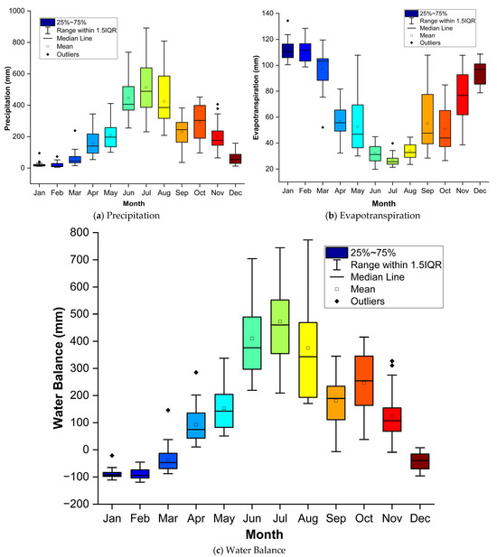 Boxplots showing the distribution of (a) precipitation (mm), (b) evapotranspiration (mm), and (c) water balance (mm) for the CRB during 2001–2023.