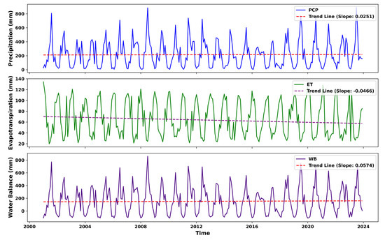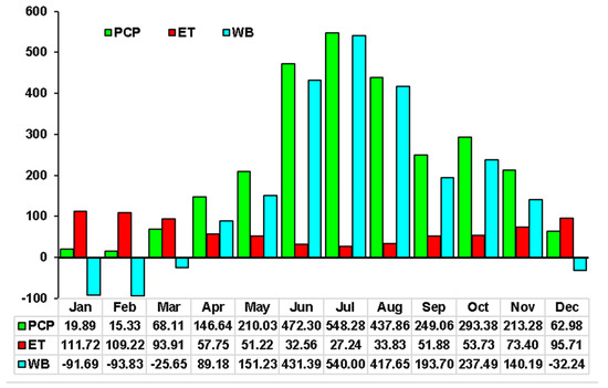 Mean monthly variation in precipitation (PCP, mm), evapotranspiration (ET, mm), and water balance (WB, mm) for the CRB during 2001–2023.