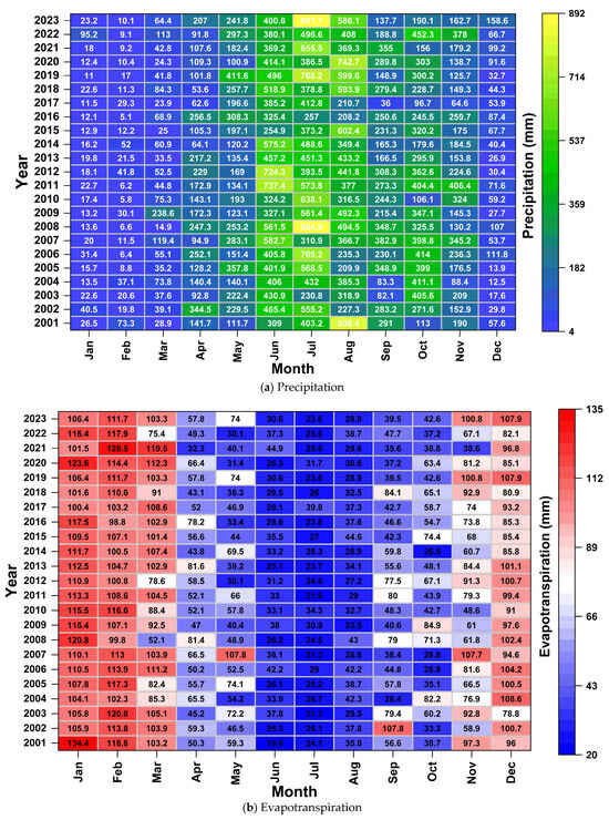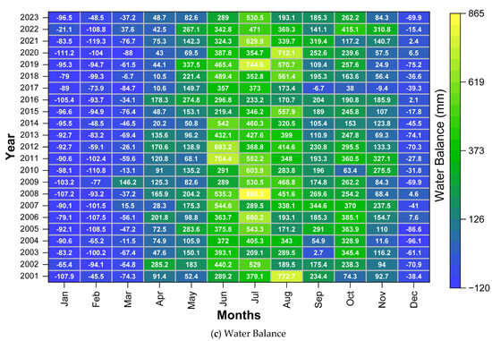 Heatmaps showing monthly averages of (a) precipitation, with strong monsoon peaks (>500 mm) and very low non-monsoon values (<50 mm), (b) evapotranspiration, with high pre-monsoon demand (100–130 mm) and lower monsoon values (30–70 mm), and (c) water balance, with large surpluses (>700 mm) in monsoon months and deficits (80 to 110 mm) in pre-monsoon, during 2001–2023.
