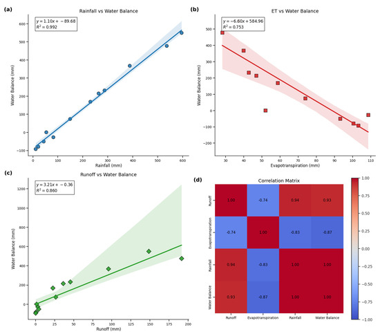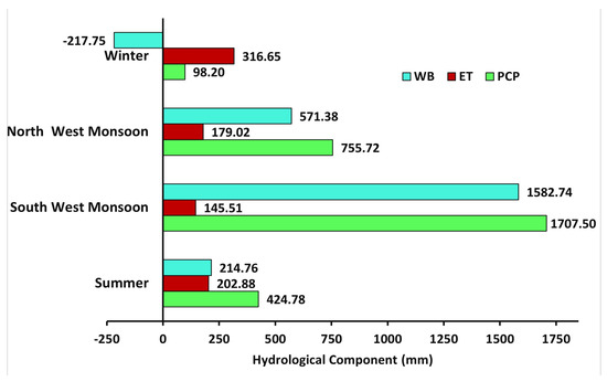 The transition from the dry season to the monsoon period is evident during the pre-monsoon months (March–May), where a gradual increase in precipitation and water balance is observed (Figure 8). Conversely, post-monsoon months (October–December) show a decline in both variables, though evapotranspiration remains relatively unchanged.