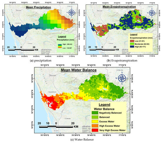 Long-term monthly mean maps of precipitation, evapotranspiration, and water balance were generated by aggregating 23 years (2001–2023) of satellite-derived data within the GEE environment. Pixel-wise temporal averaging was conducted to derive climatological monthly means, thereby capturing intra-annual spatial variability with high fidelity. The processed outputs were exported as GeoTIFF files at 500 m spatial resolution and subsequently refined in ArcGIS for cartographic standardization. Seasonal analysis was conducted based on the agro-climatic cropping calendar of Kerala, dividing the year into four agricultural seasons: Kharif (June–September), Rabi (October–November), Summer (March–May), and Winter Fallow (December–February). This approach enabled the identification of periods of moisture surplus and deficit. The analysis provides critical insights into the spatiotemporal dynamics of water availability across cropping seasons and supports the optimization of cropping systems through informed water resource planning and adaptive agricultural management.