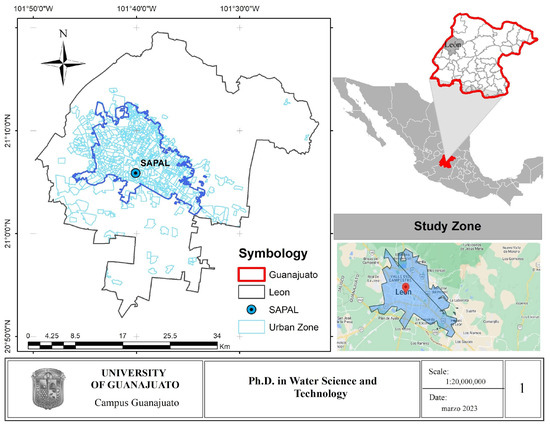 The main source of water supply for the municipality comes from the Valle de León aquifer, which predominantly covers the municipality, with water used for domestic, public, commercial, industrial, agricultural, and livestock purposes. The urban public water supply and drainage service of the city of León is administered by SAPAL, a decentralized municipal public water utility whose function is to provide potable water, sanitation, and the reuse of treated water to the urban population [25] (see Figure 1). The population served in 2019 was 1,874,553 inhabitants in León. 95.1% of these residents have access to potable water, and 95.7% have sewerage services [23]. SAPAL is supplied by 119 wells, as well as by the El Palote dam, to offer the potable water service through a distribution network of 6264 km, in addition to having 3342 km of sanitary drainage and 240 km of stormwater drainage [56].
