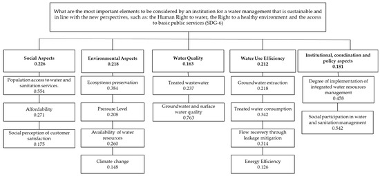 The hierarchical model depicted in Figure 2 illustrates the weighting assigned to each indicator based on the five components and the importance of each; thus, it enables the identification of the most relevant components and indicators. Based on the evaluation of the proposed indicator model, the categories deemed most significant, those that the SAPAL utility must prioritize to achieve sustainable water management in the case study, are those aligned with contemporary perspectives, namely: the human right to water, the right to a healthy environment, and access to public services. The components directly associated with these approaches are the social and environmental aspects.