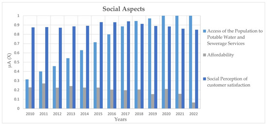 To determine whether the proposed indicators for each component exhibit optimal or unfavorable trends in water management, the membership degree was established according to the ranges provided in Table 1. In this work, the membership functions formed for the different indicators were the Gamma function and L (1 − γ). The indicators that best fit the Gamma function are (Population access to drinking water and sewerage services, affordability, social perception of customer satisfaction, ecosystem preservation, water resource availability, treated wastewater, groundwater and surface water quality, treated water consumption, flow recovery through leak mitigation, degree of implementation of integrated water resources management, and social participation in water and sanitation management), while the indicators that fit the L function are (Energy efficiency and pressure degree). The Gamma function represents indicators where higher values are desirable, while the L function represents indicators where lower values are desirable. Table 2 shows, as an example, the Gamma and L functions for the studied indicators. In this case, the X-axis will be related to the range values of each indicator.
