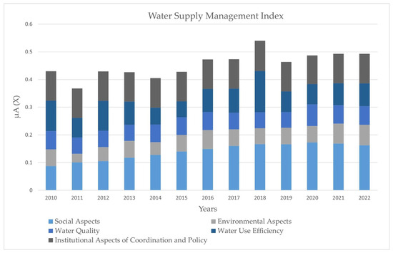 | Year | Degree of Implementation of Integrated Water Resources Management (%) | Social Participation in Water and Sanitation Management | Fuzzy Component | Weighted Component | ||
