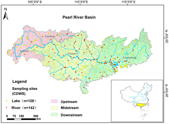 The PRB incorporates the Pearl River main flow (predominantly the Xijiang River) alongside its tributary systems, encompassing the Beijiang, Dongjiang, Liujiang, and Ganjiang watercourses. For analytical purposes, we segmented the PRB into three distinct zones based on hydrological flow patterns: upper, middle, and lower reaches. The upper segment primarily traverses Yunnan and Guizhou Provinces, while the middle section flows through Guangxi, and the lower portion runs within Guangdong. Our investigation examined 270 surface drinking water sources (SDWS), comprising 142 river-type and 128 lake-type water source locations. Figure 1 depicts both the geographical research domains and the spatial distribution of SDWS.