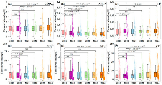 Evolution trends of annual concentration levels of CODMn (a), NH3-N (b), TP (c), SO42− (d), NO3− (e), and Cl− (f) from 2019 to 2024 (NS indicates no significance, * indicates p < 0.05, and *** indicates p < 0.001).