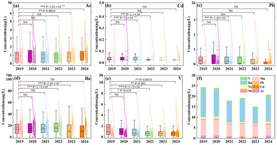 Evolution trends of annual concentration levels of As (a), Cd (b), Pb (c), Ba (d), V (e), and distribution of MMPs (f) in SDWS of the Pearl River Basin from 2019 to 2024 (NS indicates no significance, * indicates p < 0.05, ** indicates p < 0.01, and *** indicates p < 0.001).