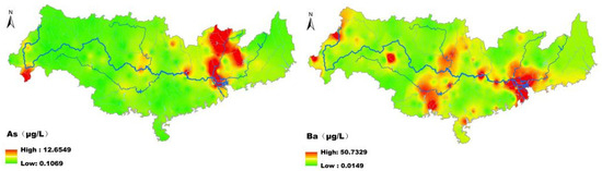 A recent large-scale survey of heavy metals in Chinese surface waters [37] found that the concentrations of Ba (mean = 30.60 μg/L) and As (mean = 1.74 μg/L) were higher than those in this study. Compared with SDWS in the Yangtze River and Yellow River Basins of China [38,39], the concentrations of the eight MMPs were at the same levels or lower in the PRB. A long-term study on the Freiberger Mulde river in Germany showed that the concentrations of Mn (mean = 74.27 µg/L) and Cd (mean = 2.98 µg/L) were higher than those in this study, and the concentrations of Mn and Cd in this study are also lower than the world river average [37].