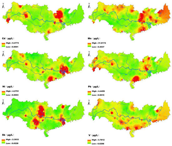 Figure 4 illustrates the concentration distribution of the eight MMPs in SDWS across the PRB. The metalloid As was mainly distributed in the lower reach of the PRB, particularly in the Beijiang River and its vicinity, potentially originating from industrial waste residues or wastewater discharged by sectors like smelting, dyeing, and tanning [40,41,42]. Ba and Sb were predominantly found in the central regions of the PRB, encompassing Guangxi Province and the downstream Pearl River Delta. Cd was more prevalent in Gejiu (Yunnan Province), southwestern Guizhou Province, and northern Guangdong Province. Ni was primarily concentrated in the downstream Pearl River Delta and southwestern Guangdong Province, while Pb exhibited higher levels in the upper reach of the PRB, as well as in northern and southwestern Guangdong Province. The presence of Sb, Cd, Ni, and Pb may be linked to emissions from mining, electroplating, and smelting industries, whereas Cd and Pb levels could also be influenced by the application of fertilizers and pesticides [43,44]. The metalloid V had broad distribution throughout the PRB, while Mn was primarily found in downstream areas and eastern Guangdong Province. Metal and metalloid levels in drinking water sources were notably elevated in the lower reach of the PRB, showing considerable regional disparities.