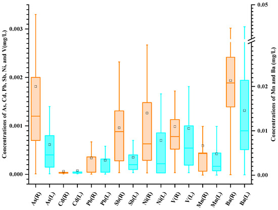 Table 2 presents the concentration statistics of the MMPs detected in SDWS of the PRB. Overall, the detection rates of these target contaminants ranged from 61% to 82%. Two or more MMPs were detectable in water samples, and the three MMPs with the highest mean concentrations were Ba (15.55 μg/L), Mn (7.43 μg/L), and V (1.32 μg/L). Additionally, the three MMPs with the highest coefficient of variation were Cd (329.48%), Pb (249.64%), and Mn (167.70%). Although Cd had the lowest detected concentration, it had the maximum coefficient of variation, which indicates the most dispersed concentration distribution and significant spatio-temporal heterogeneity. It is suggested that Cd in drinking water sources may be strongly influenced by human activities. Comparing with China’s Surface Water Environmental Quality Standards [29], none of the MMPs exceeded the limit concentrations for drinking water sources. However, the maximum concentrations of As and V exceeded the Standards for Drinking Water Quality of China and the Guidelines for Drinking-Water Quality of the World Health Organization (Table S1).