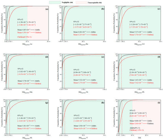 Non-carcinogenic risks of As (a), Ba (b), Cd (c), Mn (d), Ni (e), Pb (f), Sb (g), V (h), and THI (i) in adults and children by oral route ingestion.