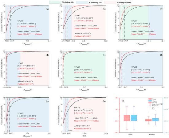 Carcinogenic risks of As (a), Ba (b), Cd (c), Ni (d), Pb (e), Sb (f), V (g), and TCR (h) in adults and children by oral route intake, and comparison of carcinogenic risks by oral and dermal routes in adults and children (i).