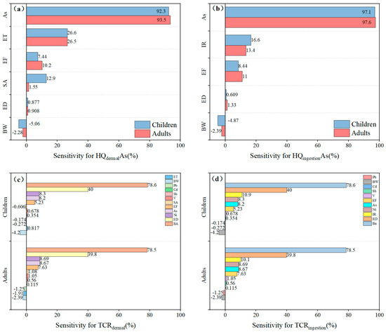 It is depicted in Figure 8a,b that the parameter sensitivity concerning HQ risks through dermal and ingestion pathways showed consistent patterns. Notably, all parameters, with the exception of body weight (BW), present positive contribution rates. The concentration of As stood out with the highest contribution rate, exceeding 90% across different pathways, particularly affecting adults. In the dermal pathway, exposure time (ET) emerged as another critical factor in non-carcinogenic risk assessment, contributing 26% for both adults and children. In the oral ingestion pathway, ingestion rate (IR) and exposure frequency (EF) exhibited positive correlations with health risks. Conversely, BW demonstrated negative contribution rates across different demographic groups. Despite the relatively small and negligible contribution values, it is essential to note that BW had a more pronounced impact on children, consistent with prior research [58,59]. Figure 8c,d illustrate the parameter sensitivity regarding TCR through dermal and ingestion pathways, considering all target pollutant concentrations and parameters.