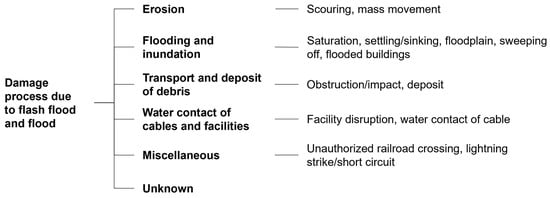 Top categories and first sub-category of damage processes for the railway infrastructure due to heavy-rainfall-induced flash flood or river flood.