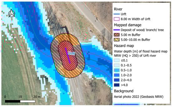 As highlighted by Lehmkuhl et al. [], it is important to analyze geomorphological processes during flood events as they can influence damage patterns. Therefore, as part of the flood damage exposure analysis, the locations of the most frequent damages were compared to the proximity of the Urft river, the river slope characteristics and the water depth from the hazard maps of NRW. The hazard maps used for this analysis are exemplified by the flood hazard map of an extreme event (HQ > 250), which describes a flood event with a statistical return period of 250 years and the flash flood hazard map for an extreme event, which was created using a simulation with uniform rainfall of 90 mm for one hour.