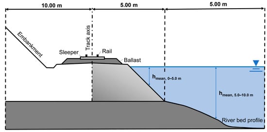 Rail infrastructure damage caused by a flood or flash flood event (refer to Figure 2) includes damaged embankments or bridges, the accumulation of debris, and the clogging of drainage, as well as derailments, disruptions and closures of railway tracks as a result of the initial damages [,,,,,,,,]. The hydraulic processes correlated with these damages are flooding with high water depth, high flow velocity and resulting forces. This can lead to scouring, erosion, washout of ballast, overtopping of bridges and transport of debris. The extent of these damaging processes can differ for the upper, middle and lower reaches of a watercourse due to their different river bed inclinations and slope gradients [].