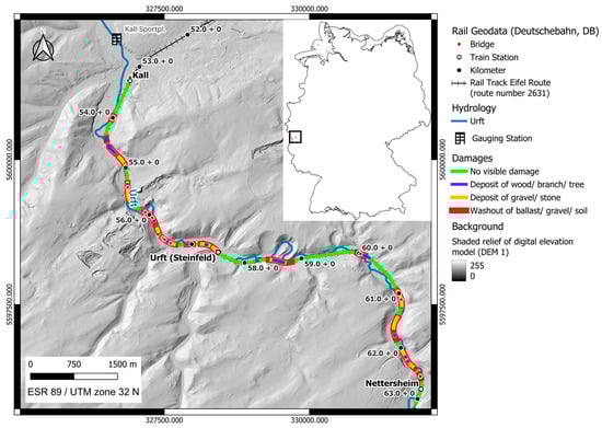 The extent of these damages and the long period of time required to reconstruct the rail infrastructure highlight the vulnerability of rail infrastructure to flash floods. Climate models indicate an increase in heavy rainfall events in frequency and intensity in Europe including Germany as a consequence of climate change [,]. Consequently, more damages to rail infrastructure due to heavy rainfalls and flash floods are expected in the future. Since rail is an important mode of transport in the context of the European transport network for goods and people, a rail infrastructure more resilient to heavy rainfall is needed. Enhanced understanding of the damage potential of flash floods and heavy rainfall to the rail infrastructure is a key issue to develop recommendations for a more resilient rail infrastructure. Therefore, this study aims to develop a new multi-criteria damage classification for flood and flash flood damages to the rail infrastructure and to conduct a detailed damage analysis on the section of the Eifel route from Kall to Nettersheim resulting from the heavy rainfall and flood event in July 2021 by applying the newly developed multi-criteria framework. For this purpose, damage data was collected, and object categories, alongside damage processes and classification, were developed for uniform analysis purposes. Subsequently, affected elements within the rail infrastructure and correlating damage processes will be analyzed.