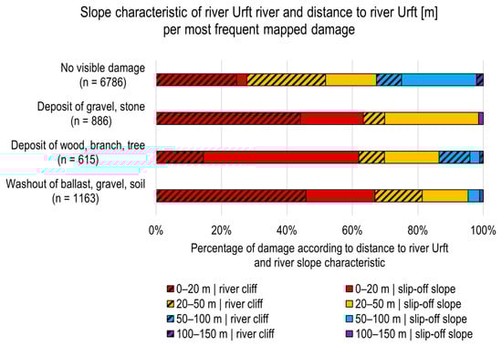 Slope characteristic and maximum distance [m] to the Urft river per most frequent mapped damage and undetected damage in photos (“no visible damage”) in percent of the damage points per mapped damage sections based on linear mapped damages by authors using the provided geotagged photos [,] and the aerial photo [].