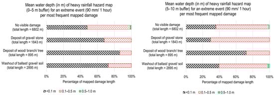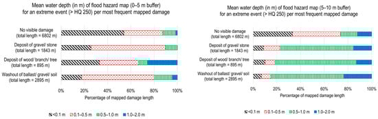Furthermore, the flood plain area of the flood hazard map for an extreme event (>HQ 250) was compared to the mapped lines of the most frequent damages. The mean water depth for a 5.0 m buffer (left) and a 5.0 m to 10.0 m buffer (right) are displayed in Figure 15. Within the 5.0 m buffer, water depth of up to 2.0 m is present for all damages. The washout of ballast, gravel and soil, and the deposit of gravel and stone are mostly present between 0.1 m to 0.5 m (around 60% each). The deposit of wood, branches and trees mostly occurs with similar percentages below 0.1 m, between 0.1 m and 0.5 m and between 1.0 m and 2.0 m with around 30% each. No damages occur mostly below 0.1 m within the 5.0 m buffer. Considering the 5.0 m to 10.0 m buffer, damages mainly occur at water depths between 0.5 m and 1.0 m (around 60%), whereas no visible damage mainly occurs at water depths below 0.5 m (around 70%).