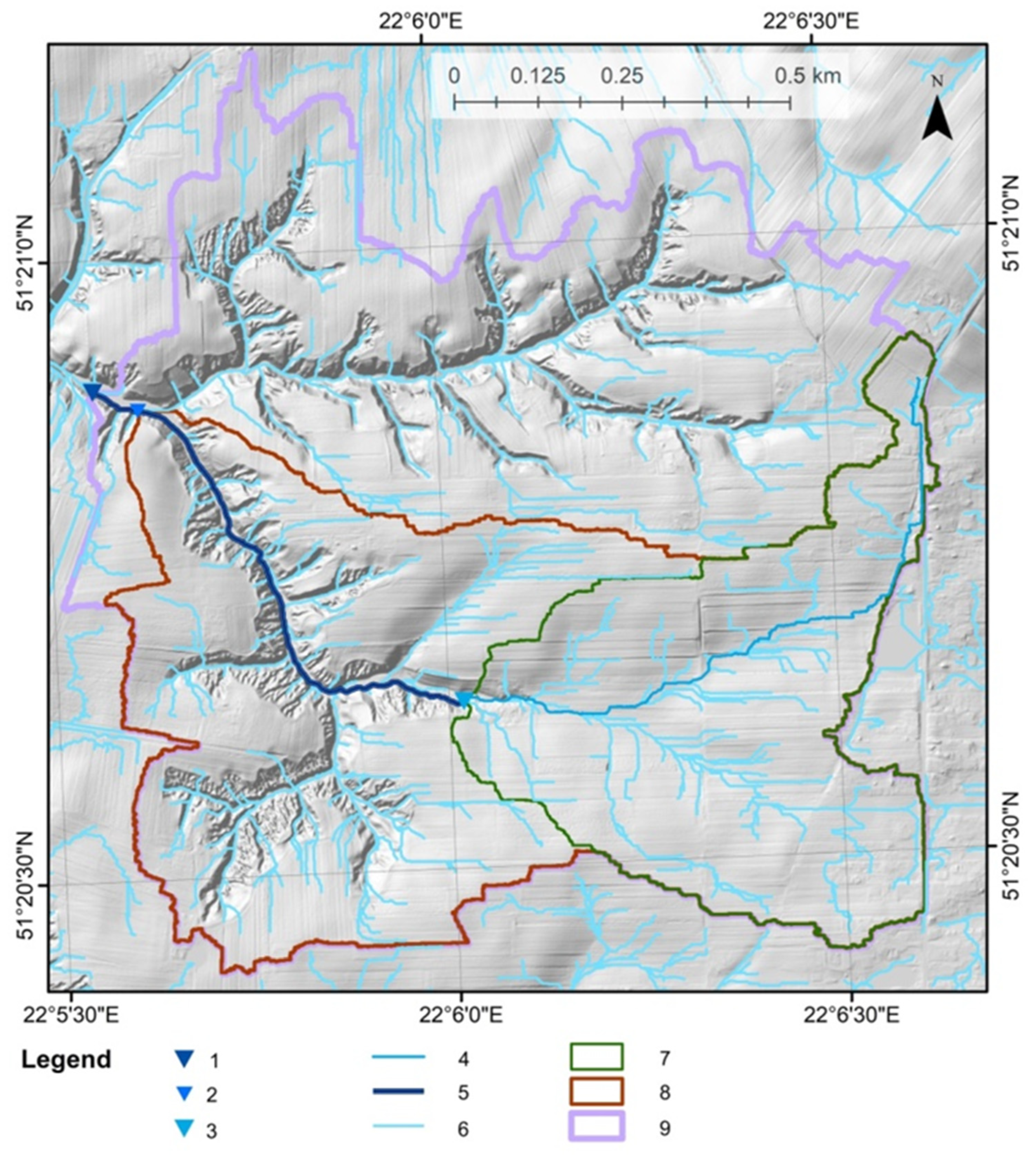 The study carried out during the 2013 hydrological year showed the important role of the slope subcatchment (about 25% of the catchment area) in the formation of water runoff and as a source of sediment for the gully system. During thaws, longitudinal transport dominated on the slope and as much as 90% of the SST came from the slope subcatchment area. On the other hand, branched and forested gully systems play a significant retention role by capturing and delaying snowmelt runoff. In gully systems during snowmelt, transverse transport with piping dominates. During summer downpours, the delivery of slope material from agricultural fields accounted for approx. 15% of the material removed from the gully catchment area, which confirmed the predominance of transverse transport in the slope catchment area and longitudinal transport in the gully. During summer downpours, material from soil erosion was repeatedly redeposited on local denudation bases and, as a result, only a limited amount reached the gully. In the gully during downpours, longitudinal transport dominated and the main source of SST was the gully bottom, which was mainly cut by linear erosion processes (deep and back erosion).
