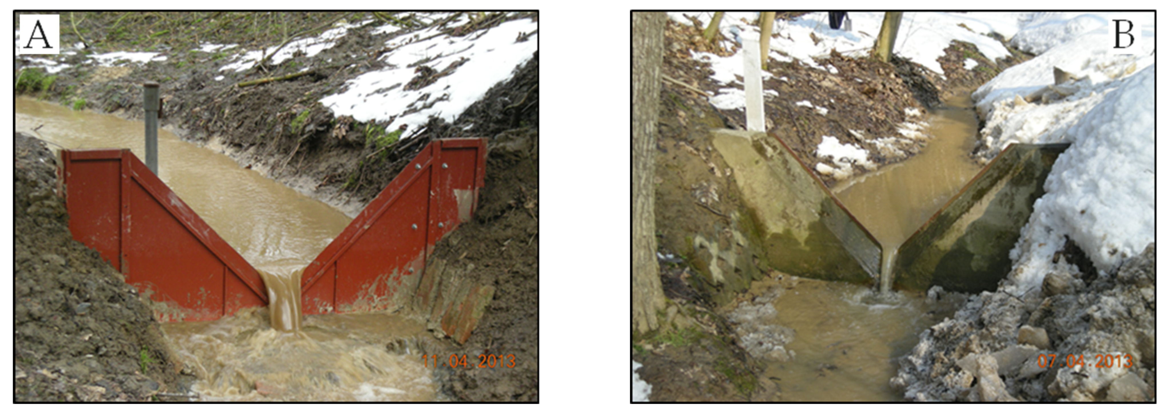 Detailed studies of the sediment transport in a cascade system were conducted in the catchment area of the Kolonia Celejów gully, which consists of three subcatchment areas with diverse hydromorphological conditions (Figure 2). The total amount and intensity of precipitation were measured using a TPG-023 automatic rain gauge manufactured by A-STER in the subcatchment area of the Grabczyna gully. Water levels were recorded at the outlet of the catchment area at a triangular Thompson weir with a water gauge patch (Figure 3). The recording has been carried out continuously since 2003 using an electronic limnigraph (THALIMEDES by OTT). In order to determine the amount of sediment transported in the slope–gully cascade system, a similar station was installed in November 2012 at the gully head on an abandoned farm (Figure 3A). Because the new owner reactivated the pond that had once existed there, this station only operated until June 2013. The water flow was calculated using Thompson’s formula for small streams, which was determined empirically for a triangular weir with an opening angle of 90°: