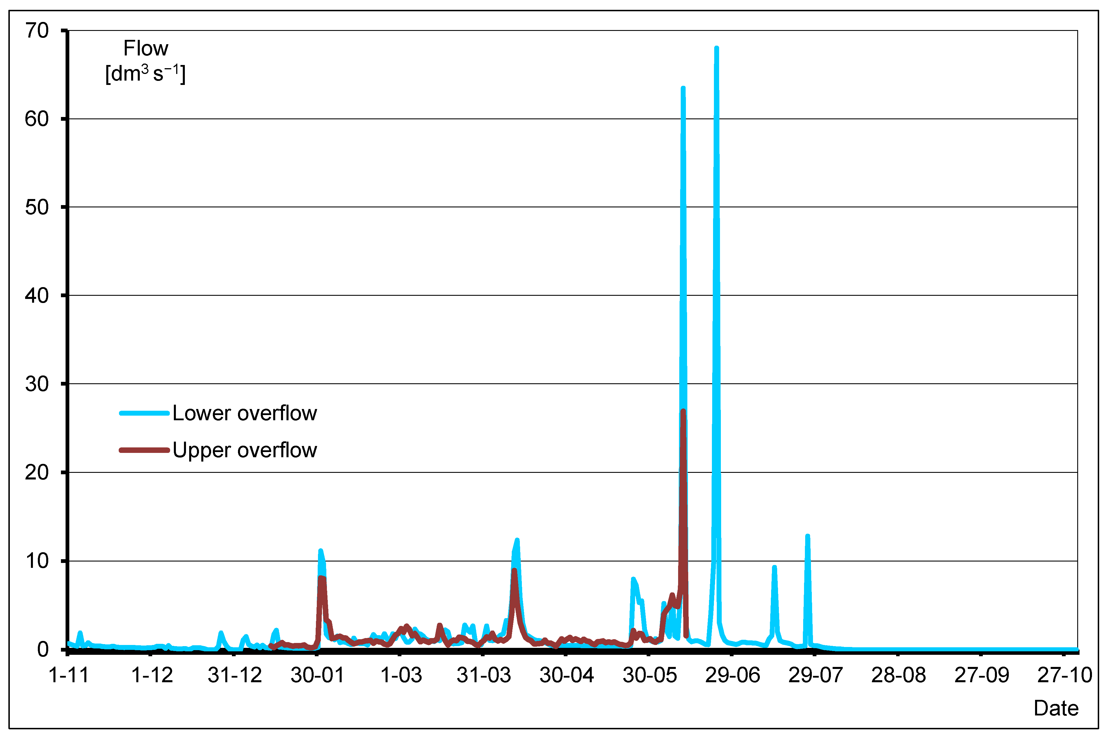 The flows in the upper overflow, which closes the slope subcatchment area, were well correlated with the flows in the lower cross-section at the mouth of the gully catchment area. During winter and spring thaws, the maximum flows in both overflows were similar, which indicates a delay in runoff in the gully catchment area due to the high retention capacity of the accumulative gully bottom. However, during summer downpours, flows at the catchment closure increased by over 200%, mainly as a result of an increase in the drained area.