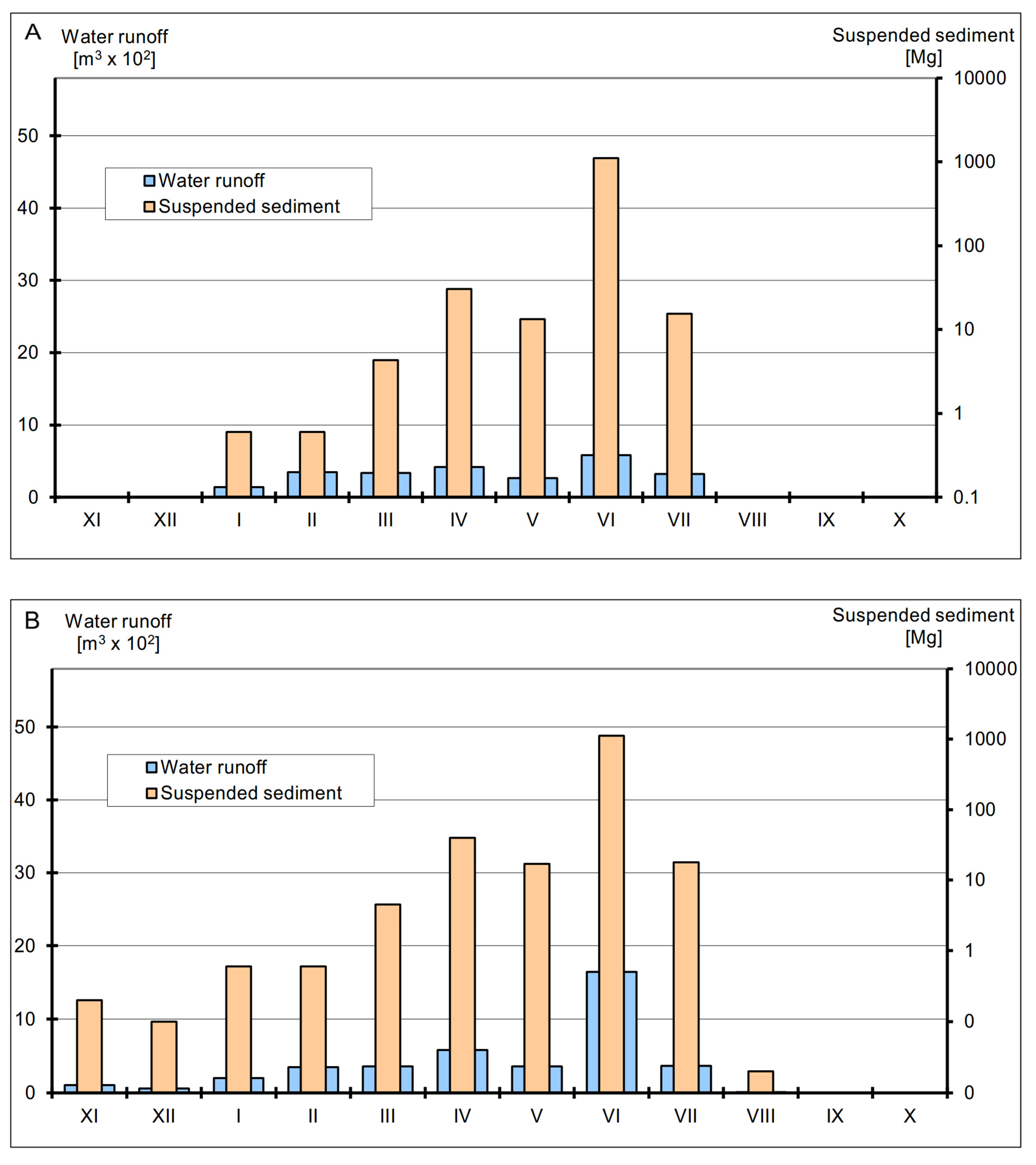 In the period of 2003–2022 in the loess gully catchment, high variability in water runoff was observed (with a max. of about 76,000 m3). In the second half of this period, a large increase in SST (to about 1200 Mg) was noted as a result of numerous downpours. In the extremely effective year of 2013, the water runoff was about 40,000 m3 and the SST was >1197 Mg, which account for 7.6% and 33.5% of the 20-year totals, respectively. During the cool half of the year, the gully discharged 16,490 m3 of water (42% of the annual total) and had an SST of about 60 Mg. During the warm half of the year, 23,742 m3 (59%) of water was discharged and the SST was about 1137 Mg (95%). June delivered a record-breaking amount of over 1100 Mg of suspended sediment (92% of the annual total SST).