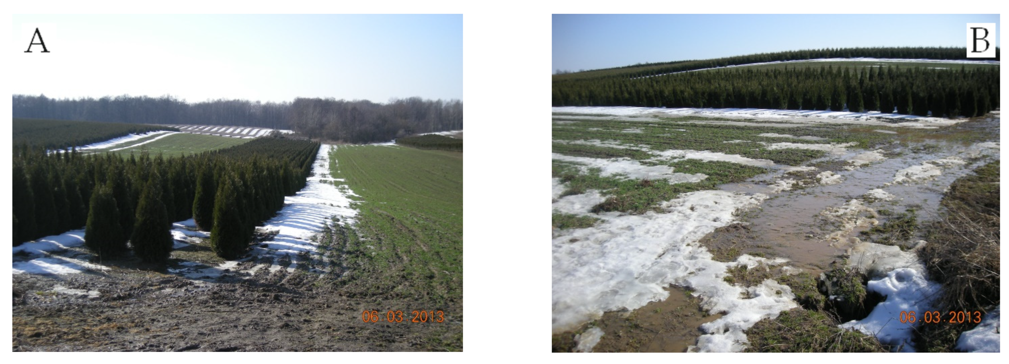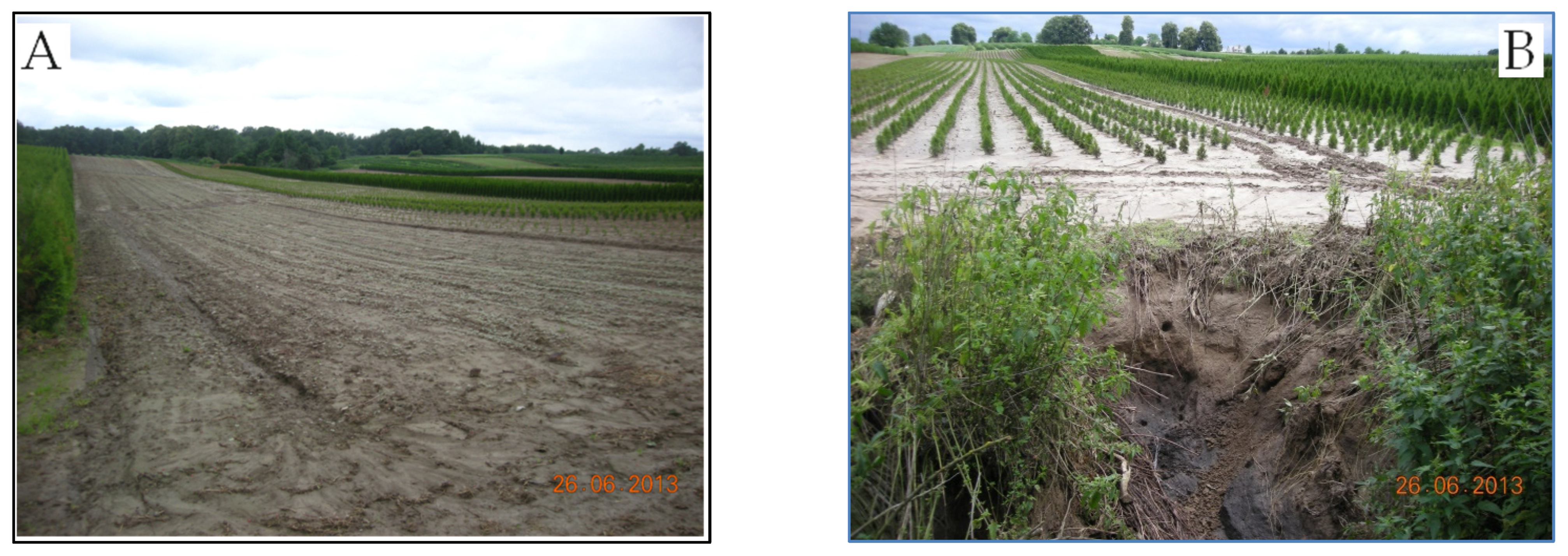 A comparison of the activity of the two main arms of the gully showed that the complete cutting of the catchment area limited the supply of water to the gully system. Cutting only the lower part of the catchment area left a significant feeding area in the form of a slope catchment area, which resulted in an increase in water runoff from the gully catchment area. In addition, this effect was enhanced in the catchment as a result of the establishment of thuyas plantations above the head of the main gorge in 2013. The research carried out in the gully catchment simultaneously highlighted the role of the agricultural activity on the slope subcatchment in shaping the retention capacity of the catchment and surface water runoff. The introduction of ornamental crops, e.g., thuya, especially in the early years, did not provide sufficient soil protection during snowmelt and summer downpours. In 2013, high concentrations of runoff were observed in thuya plantations, and there was accelerated soil erosion and an increase in gully erosion rates. It appears that in addition to the implementation of extensive and sustainable farming in sensitive areas, it is advisable to introduce turf to the areas between crop rows, especially in the early years of establishing a plantation. It is also necessary to continue research into the impact of ornamental plants, whose acreage is increasing significantly, with a focus on their protective function and ability to shape surface runoff in gully catchments.